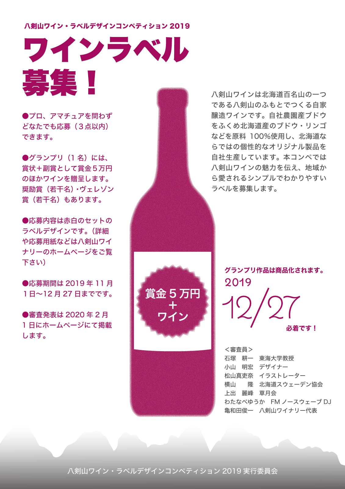 <(参考)2019年コンペの募集案内> 例年の八剣山ワインラベルコンペ、今年は全体をリフレッシュして再スタートです。どなたでもご応募いただけます。詳細は、コンペチラシ、応募要綱をご覧ください。 応募期間 2019年11月1日(金)~2019年12月27日(金)必着 審査発表 2020年2月1日(土) 八剣山ワイナリーホームページに掲載 表彰式 2020年2月15日(土)15:00~18:00 2019コンペチラシ(JPG737kB) 2019募集要項(PDF 127kB) |